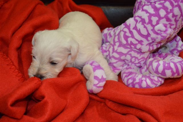 She had 4 girls; 3 boys. With us keeping 2 girls I have 2 girls and 3 boys available. They are $600, from purebred registered parents (AKC/CKC) with excellent pedigrees and health records. Health certificate, guarantee, etc. same as our schnoodles goes along with the babies.