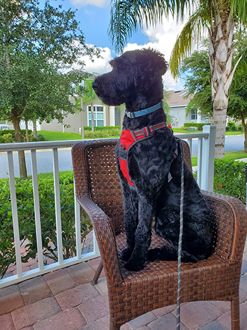 Below is a picture of him in his favorite place on the porch watching the neighbors. Also one of him in the pool at his daycare, Pet Paradise. He loves the pool!
