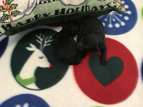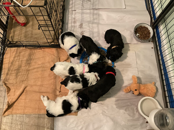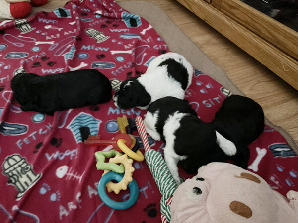 Esther had her babies on Monday 12/14. A beautiful mix of blacks and parties. Zack is the daddy and the Parti color came through. 7 babies are being placed and waiting families being notified. This is Esther’s first litter and she did great. Calm and gentle. Being a great mom like her mom Naomi. Her daddy is Isaac and she is so sweet.