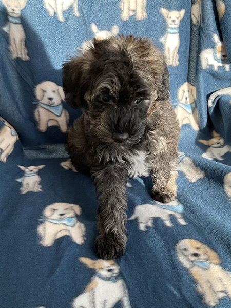 This is the brown/brindle male pup going to the Cadman family of NC. They already have a Pierce Schnoodle and need another! This guy is so handsome! Unique in his markings. He will be joining older kids too so lots of fun time and attention. With a Schnoodle brother he will be happy!