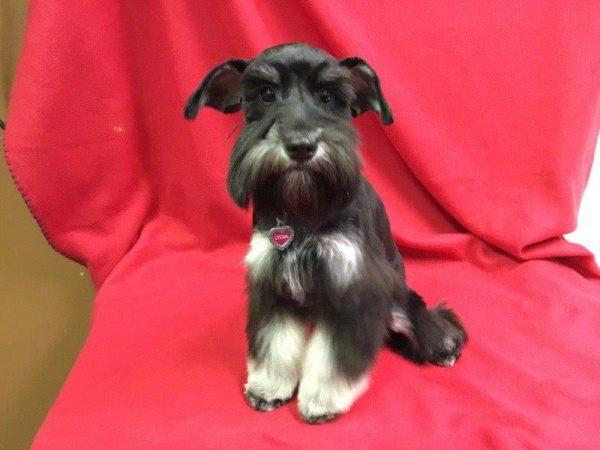 Our beautiful super coated, black and silver Lydia! Her mom was super coat Jolie, now retired living the great life and her dad, Meschach, is our handsome liver male schnauzer.